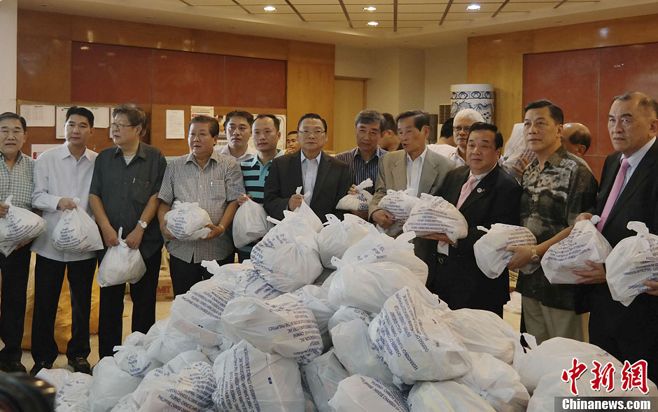 11月12日,菲律宾菲华商联总会等华社团体召开记者会,向媒体介绍当地华人募款参与赈灾情况。图为参与发起救灾行动的华社团体负责人向媒体展示即将运往灾区的救灾物资。超强台风“海燕”日前在菲律宾中部登陆,造成严重灾情,菲华商联总会等华社团体第一时间启动救灾应急机制,发起救灾行动,获得当地华人积极响应。中新社发 张明 摄