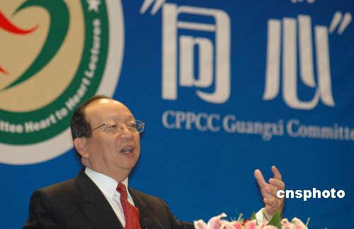 十月二十四日,生于桂林的蒋经国之子蒋孝严,在乡亲们面前承诺,他将积极推动桂林成为两岸节日包机直航点。蒋孝严先生是受广西政协之邀作题为“两岸经贸关系”的讲座时作上述承诺的。中新社发 蒋雪林 摄