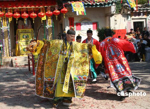 1月1日,台湾“玉二妈庙”寻根谒祖团一行30多人到福建东山岛铜钵妈祖庙认祖还愿,拉开新一年两岸民间宗教民俗交流活动的序幕。图为认祖还愿现场的民俗表演。中新社发 朱少文 摄