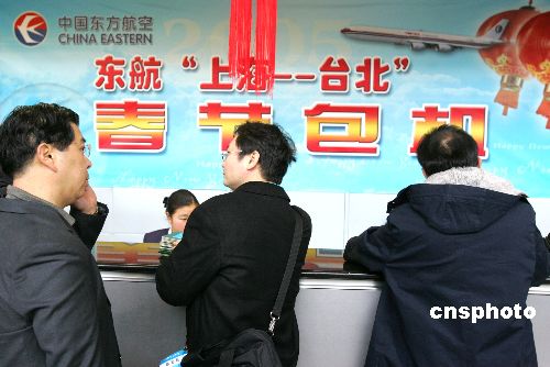 随着春节的日益临近,今年两岸春节包机的机票销售也进入尾声。一月十日,上海航点东航、上航的包机机票已基本售完,目前仅剩少量公务舱机票。随着春节包机逐年步入常态化,不少台胞吸取以往抢票的经验,为尽早敲定机票,可谓八仙过海、各显神通。雇佣富有排队经验的大陆快递员购票成为今年售票中心里的特殊风景线。中新社发 汤彦俊 摄