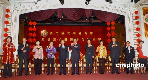 二月二十八日,澳门妇女联合会在万豪轩酒店举行酒会,庆祝“三八”国际妇女节。澳门特首何厚铧出席酒会并致辞:我谨代表澳门特别行政区政府向全澳妇女致以崇高的节日敬意,恭祝各位新年进步,万事如意。 中新社发 史利 摄