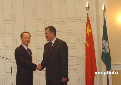 三月一日,澳门特别行政区政府在政府总部举行运输工务司司长就职仪式,获中央政府任命的刘仕尧依法宣誓,澳门特别行政区行政长官何厚铧受国务院总理委托监誓。图为何厚铧祝贺刘仕尧任澳门特别行政区运输工务司司长。中新社发 史利 摄