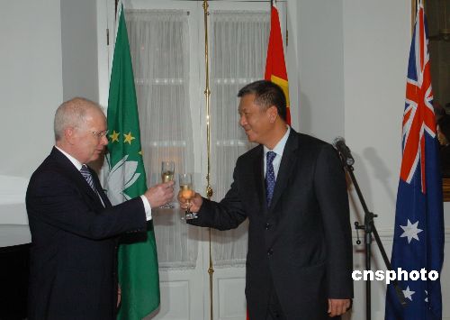 三月二日,澳门特首何厚铧与澳洲驻香港总领事郭缪伟举杯,共贺友谊。澳洲驻香港总领事馆在陆军俱乐部举行招待会,庆祝澳洲与澳门特区之间前所未有的经济、文化及体育方面的密切联系与合作。目前约有1500多名澳洲人居住在澳门,预计在未来一年将会再增50%。 中新社发 史利 摄