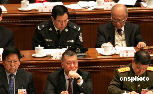 十届全国人大五次会议三月五日上午在北京人民大会堂隆重开幕,澳门特区行政长官何厚铧(中)出席开幕式。中新社发 任晨鸣 摄
