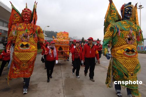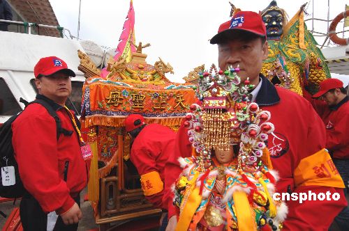 三月九日下午,台湾马祖天后宫信众携妈祖金身抵达福州马尾港。三月十日至十一日,福建连江县将举办首届妈祖文化旅游节,110位马祖乡亲携妈祖金身跨海赴会,这是新中国成立以来连江与马祖民众共同参与的人数最多的一次民间盛会。中新社发 王东明 摄