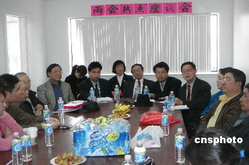 美东华联总会法拉盛分会三月十四日就“两会”热点问题举行座谈会。 今年的“两会”为海外华人华侨广为关注。连日来,纽约华人华侨从电视和报纸上了解“两会”的内容,一些社团还就“两会”的一些热点展开热烈讨论。中新社发 刘小青 摄