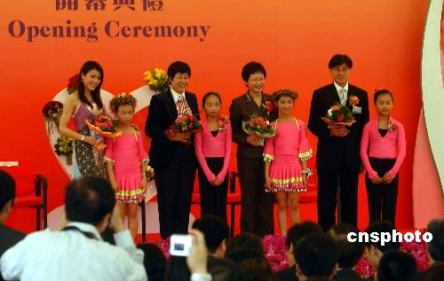 16日,香港康乐及文化事务署署长周达明、民政事务局常任秘书长林郑月娥、立法会民政事务委员会主席蔡素玉及2006年香港小姐冠军陈茵媺(右起),任“二○○七年香港花卉展览”开幕典礼主礼嘉宾。中新社发 谭达明 摄