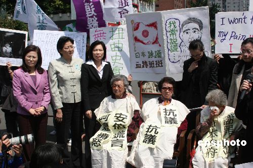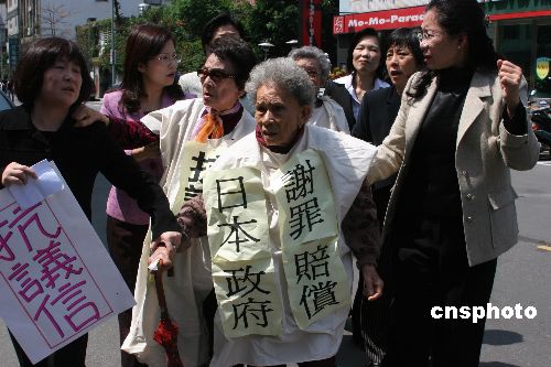 三月二十一日,台湾慰安妇受害幸存者九十一岁的吴秀妹和八十五岁的苏寅娇、八十二岁的卢满妹到位于台北市庆城街的日本交流协会举行抗议活动,要求日本政府遵循“河野谈话”,尽快对慰安妇受害幸存者谢罪赔偿。中新社发 耿军 摄