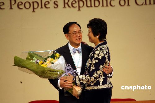 3月25日,香港2007行政长官选举结束,曾荫权(右)取得649票,以高票当选第三届行政长官人选。选后,曾荫权与妻子相拥祝贺当选。中新社发 王丽南 摄