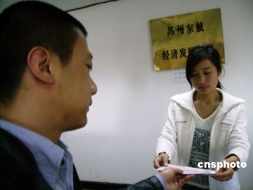 2007年3月28日,在苏州工作的陈先生从工作人员手中领取预订的包机机票。今年是两岸首次开通清明包机,据东航苏州分公司28日最新统计,截止当日,共售出包机机票100多张,比今年春节包机售出500多张机票减少近四成。主要是因为今年春节比较迟,而清明之后马上就是“五·一”长假,春节和劳动节两个节日相隔时间比较短,所以不少在苏州工作的台湾同胞此次不在清明包机返乡,不过他们希望两岸直航包机能够常态化。中新社发 李俊锋 摄