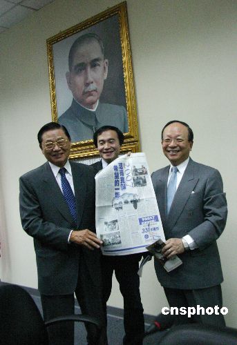 三月三十日,台北,中国国民党代理党主席江炳坤(左),国民党籍“立委”蒋孝严(右),国民党文化传播委员会主委杨渡,在记者会上共同展示该党在媒体上刊出的“不爽很久了,出来呛声吧”的广告。中国国民党三月三十一日将举办“三三一”大游行活动,抗议当局“去中化”、“去蒋化”的一系列政策,号召三到五万人参加,表达“蓝色的愤怒”。中新社发 吴庆才 摄