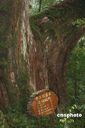 坐落于台湾桃园县的拉拉山,海拔自一千三百六十到一千七百八十米。山中拥有由树龄在四百至两千八百年间的一百二十棵巨木组成的巨木群落。经过专家编号的巨木共有二十四棵,可以对游客开放。图为树龄在二千二百年的第十二号巨木“五福临门”。中新社发 耿军 摄