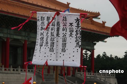 四月五日清晨即有近千位来自黄埔军校不同期别的老兵,齐聚“中正纪念堂”,纪念蒋介石先生逝世三十二周年并抗议台湾当局与军方推动“去蒋化”。图为一位老兵高举的抗议大旗。中新社发 耿军 摄