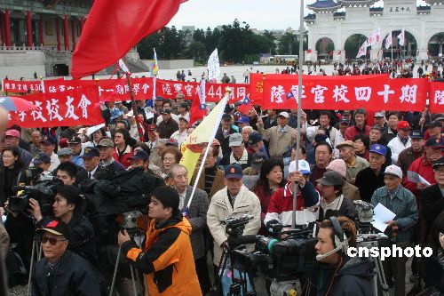 由郝柏村与蒋方智怡等发起的台湾各界纪念蒋介石先生逝世三十二周年致敬大会四月五日在“中正纪念堂”举行,清晨即有近千位来自黄埔军校不同期别的老兵,举着属于自己期别的布条,齐聚“中正纪念堂”,抗议民进党政府与军方推动“去蒋化”。中新社发 耿军 摄