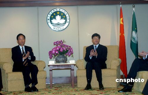 四月十日,中华人民共和国最高人民检察院检察长贾春旺首席大检察官(左)率代表团一行在澳门特区检察院检察长何超明(右)的陪同下,访问澳门特区检察院。贾春旺检察长是来出席明日举行的第四届中国-东盟总检察长会议的。 中新社发 史利 摄