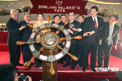 四月十五日,台北时尚地标、知名商业购物中心“京华城”在大陆扬州开业“姐妹城”。中国国民党副主席江丙坤、林益世一行参加扬州京华城开业庆典。扬州“京华城”项目是由著名台商、威京集团主席沈庆京总策划并亲力打造。这是台商在中国大陆实践的首个“全生活广场”案例,堪称长三角地区的“商业巨鲸”。图为国民党副主席林益世及两岸知名人士为扬州“京华城”开业启航。中新社发 潘索菲 摄