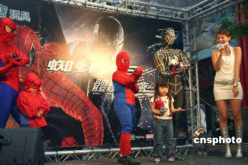 令全球影迷瞩目的“蜘蛛侠(三)”即将于五月一日热力引爆,独家引进电影版系列玩具的“孩之宝”玩具公司,在四月十五日举办“蜘蛛侠体验大会”活动。图为台北市信义威秀中庭活动现场,两位可爱的小朋友和心目中的英雄“蜘蛛侠”亲密接触。中新社发 翁阳 摄