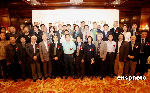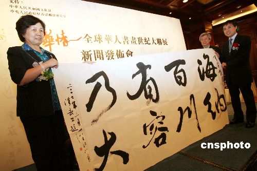 庆祝香港回归十周年,全球华人书画世纪大联展17日在香港举行新闻发布会,中国文联﹑中国美协﹑中联办﹑香港民政事务局代表以及中国美协赴港采风团龙瑞﹑邓林等三十位来自全国各地的著名画家和香港知名书画艺术家出席。据介绍,参展的300幅作品中,有多位书画大师的作品。这些作品将于2007年7月2日至5日在香港中央图书馆和香港大会堂展出。中新社发 王丽南 摄
