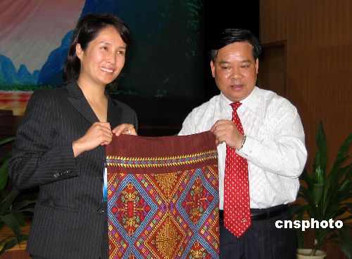 四月二十二日,台湾“立法委员”高金素梅率台湾民族文化代表团抵达广西南宁,开展为期五天的“桂台民族文化交流活动”。在当天下午的见面会上,广西自治区民委官员向高金素梅(左)赠送壮锦。中新社发 林艳华 摄