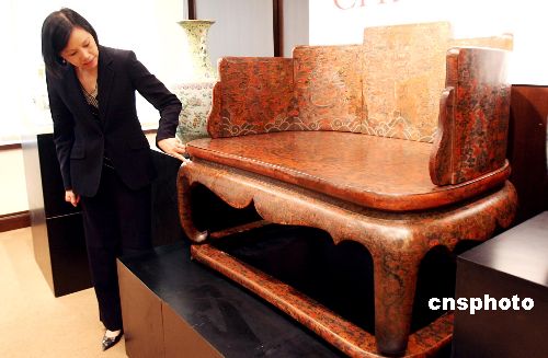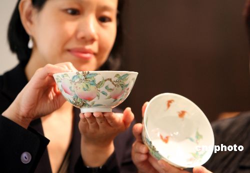 香港佳士得将在5月29日举办拍卖会,推出逾300件中国宫庭御制瓷器及艺术品珍品。9日,佳士得拍卖行向新闻界预展部分精品。中新社发 洪少葵 摄
