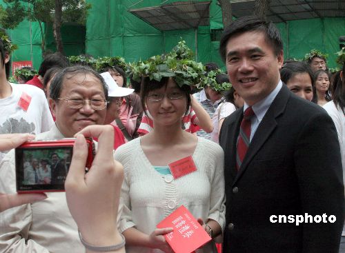 在五月十三日举行的台北市中正区母亲节博爱嘉年华暨成年礼、单亲妈妈表扬活动中,台北市长郝龙斌向参加成年礼的青年赠送读书券等礼物。中新社发 陈立宇 摄