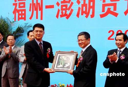 5月15日,参加福州-澎湖货运直航首航仪式的中共福州市委副书记周宏(左三)向澎湖地区两岸交流协会理事长林炳坤(右二)赠送纪念品。当日,福州-澎湖货运直航首航仪式在福州市连江县琯头对台贸易码头隆重举行,此次货运直航是福建沿海与澎湖实现货运直航常态化的首次直航。中新社发 刘可耕 摄