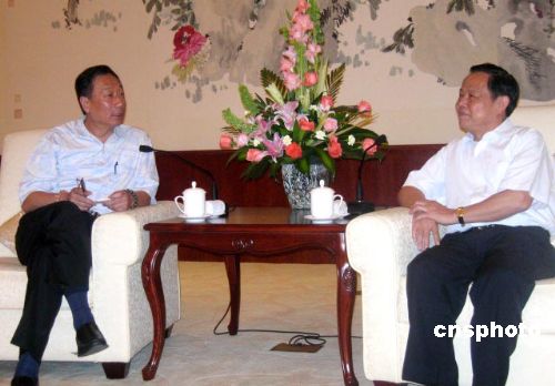 五月十六日,台湾鸿海集团总裁郭台铭乘专机飞抵广西南宁,对南宁进行一天的考察,受到广西自治区主席陆兵的接见。此次是郭台铭第二次来广西,计划在广西中越边境投资设企业,准备投资五十亿美元在越南建科技园。中新社发 夏晓弘 摄