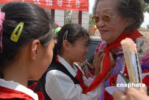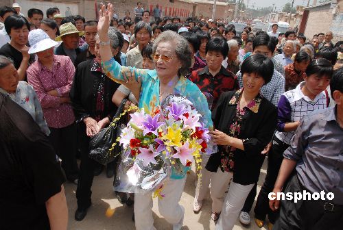 5月27日至31日,1950年移居香港的齐慧杰女士,来到她捐资140多万元兴建的“茌平县实验小学慧杰教学楼”、“温陈中学慧杰试验教学楼”、“温陈乡齐庄村慧杰小学”看望孩子们。齐慧杰女士每次回家乡,还向齐庄村的162户父老乡亲每户资助300元人民币。齐慧杰女士生于山东省茌平县温陈乡齐庄村,早年在香港定居,今年87岁,晚年思乡之情倍增,所以把晚年的爱全部倾注到了养育她的故乡。中新社发 史奎华 摄