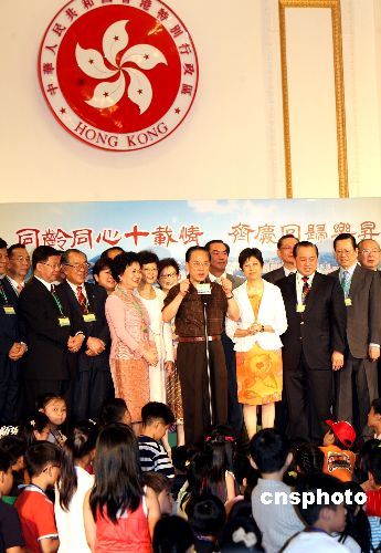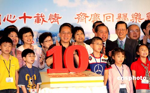 100多名在97年7月1日出生的香港儿童,6月2日在礼宾府参加《同龄同心十载情 齐庆回归乐升平》生日会,特首曾荫权与夫人曾鲍笑薇与孩子一同唱生日歌和切蛋糕。中新社发 王丽南 摄