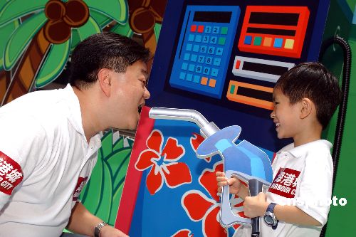 6月6日,一名小孩正为爸爸“加油”打气。当日,香港海港城举行“爸爸加油站”活动,迎接一年一度的父亲节,吸引人流。中新社发 蔡蔓莉 摄