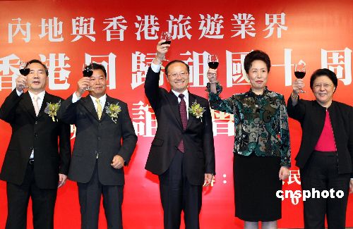 六月十五日晚,内地与香港旅游业界庆祝香港回归十周年联谊会在香港举行,香港特区经济发展及劳工局局长叶澍堃、外交部驻香港特派员吕新华、国家旅游局局长邵琪伟、中央驻香港联络办公室副主任郭莉、香港特别行政区立法会主席范徐丽泰(从左至右)等举杯相庆。中新社发 武仲林 摄