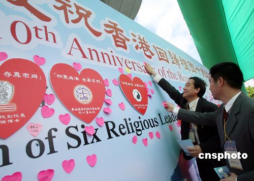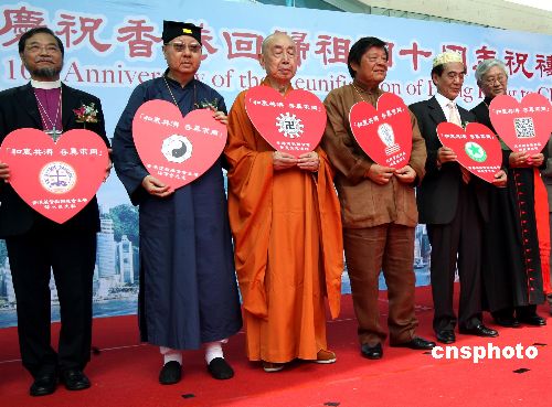香港六宗教界六月十六日在紫金广场隆重集会﹐举办庆祝香港回归十周年祝祷大会﹐祝愿香港繁荣安定﹐社会大众家庭康泰﹐祖国昌盛﹐世界和平。中新社发 王丽南 摄