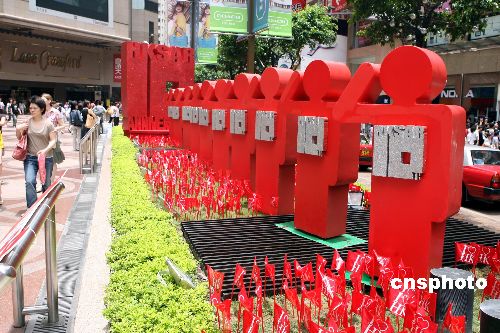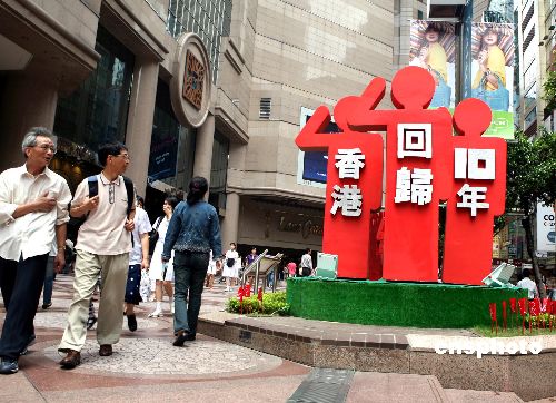 香港回归十年,商家借题发挥。香港时代广场近日竖起“香港回归十年”雕塑,并在6月17日至7月15日期间的星期天,举行“shop尽情购物有奖,奖励十年的努力”活动。中新社发 王丽南 摄