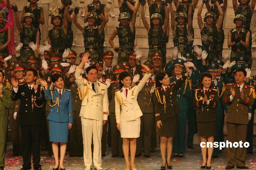 六月十九日晚,中国人民解放军战士文工团大型文艺晚会《神圣》在香港演出,以庆祝香港回归祖国暨中国人民解放军进驻香港十周年。图为演员向观众致谢。中新社发 武仲林 摄