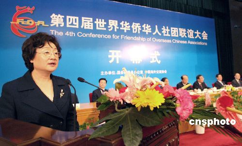 六月二十日,由中国国务院侨务办公室、中国海外交流协会主办的“第四届世界华侨华人社团联谊大会”在人民大会堂隆重开幕。国务委员唐家璇出席开幕式并致辞。国务院侨办主任李海峰在开幕式上作题为《和睦相融 合作共赢——构建一个充满活力的华侨华人社会》的主题报告。全国人大华侨委员会主任委员陈光毅、全国政协港澳台侨委员会主任郭东坡、中国侨联主席林兆枢、中国致公党中央副主席杨邦杰、国务院侨办副主任赵阳、许又声、马儒沛、任启亮以及中国海外交流协会副会长林文肯等相关部门负责人出席了开幕式。图为国务院侨办主任李海峰在大会开幕式讲话。中新社发 张勤 摄