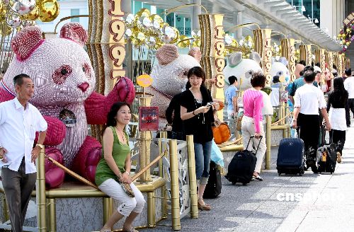 香港尖沙咀海港城在门前竖立十只巨型熊猫雕像﹐代表从1997至2007年﹐香港回归十周年的历程﹐创意轻松而活跃﹐引来无数市民和游客拍照留影。中新社发 王丽南 摄