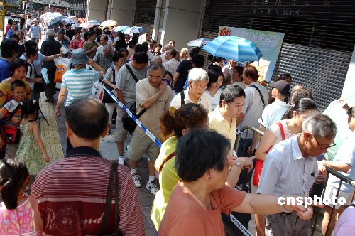 庆祝香港回归的解放军跳伞表演活动门票,24日早上在港九新界4个地点派发。在长沙湾政府合署排头位的张女士,昨晚10点已经到来,她说知道今次是解放军八一跳伞队首次来港表演,特意排队取票观赏。中新社发 谭达明 摄