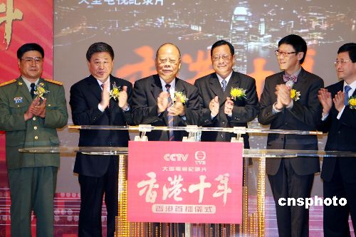6月25日,中央电视台为庆祝香港回归十周年特别制作的大型电视记录片《香港十年》开播首映式在香港举行。中央电视台副台长张长明(左二)、无线电视业务总经理郭志云(右二)、香港政制及内地事务局长林瑞麟(右)、曾宪梓(左三)等嘉宾主持启播仪式。中新社发 洪少葵 摄
