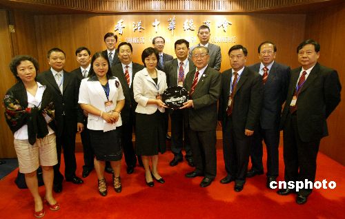 香港回归十周年前夕,重庆侨联赴香港访问团拜访中华总商会。今年是重庆成立直辖市十周年,为此,六月十八日重庆市举行了丰富多彩的庆祝活动,更由于适逢香港回归十周年,重庆市确定该市的庆祝主题为“同喜同贺 和谐社会”。由重庆归国华侨联合会主席罗静虹带队的赴港访问团及演出团一行,除采访外还为香港侨界社团联会成立三周年文艺晚会带来了精彩的文艺演出。中新社发 任海霞 摄