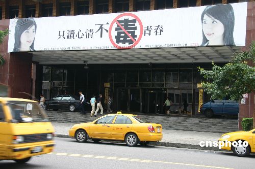 | 六月二十六日是“国际禁毒日”。台北市内多座大型建筑悬挂出针对青少年的禁毒标语,台北地方法院的大门口也挂出“只读心情,不毒青春”的标语。目前台湾社会上吸食大麻者七万人左右,服用摇头丸者约九万人。高中辍学的青年涉毒率达百分之十一。台湾“卫生署”表示,青少年初期是接触入门毒品的高峰年龄,随着年龄增长则是非法药物滥用的快速成长期。最近调查发现,台湾的中学生药物滥用率在百分之一至二之间,大学生则高达百分之二点一。中新社发 耿军 摄