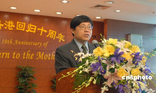 六月二十六日,中国驻纽约总领馆举行招待会,隆重庆祝香港回归祖国十周年。图为代总领事旷伟霖致辞。中新社发 龚文谟 摄