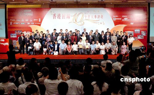 6月27日,由香港十三间传媒机械联合主办的《香港回归十周年十件大事评选》活动圆满结束,并隆重举行颁奖典礼。中联办副主任李刚、劳工署署长陈甘美华等社会名人出席担任颁奖嘉宾,并与获奖者于会上合照。中新社发 邓庆乐 摄