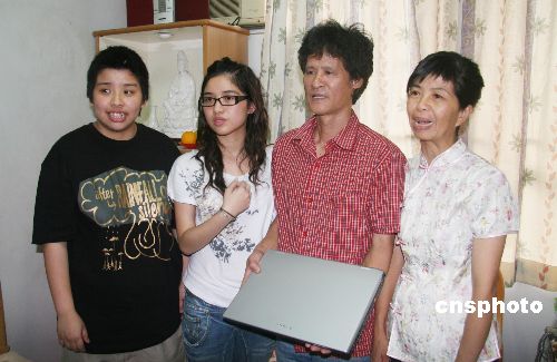 六月二十九日,中国国家主席胡锦涛探访居住在香港马鞍山颂安村的香港市民梁志星一家,并赠送他们一台笔记本电脑。图为梁志星夫妇和两个女儿。中新社发 齐彬 摄
