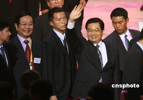 六月三十日晚,国家主席胡锦涛在香港会展中心出席庆祝香港回归十周年大型文艺晚会。演出结束后,胡锦涛主席向观众挥手致意。中新社发 武仲林 摄