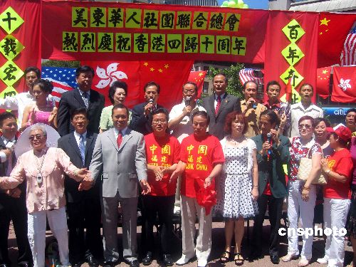 美东华人社团联合总会当地时间六月三十日在林则徐广场隆重举行“庆祝香港回归祖国十周年庆典”活动,图为中国常驻联合国代表王光亚和中国驻纽约总领事刘碧伟与纽约华人侨团的代表们在庆祝会上高唱《歌唱祖国》。 中新社发 邓悦 摄
