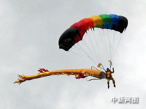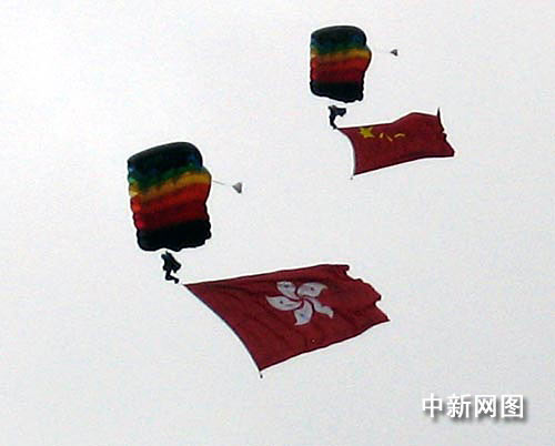 今天解放军八一跳伞队的跳伞人员将和香港的跳伞队员一起,为香港市民带来10个精湛的跳伞项目,这10个项目包括吉祥如意、赤子回归、欢庆盛典、东方之珠、金龙飞舞、香江彩虹、香港之星、紫荆盛开、巧叠罗汉和仙女下凡。徐长安 摄