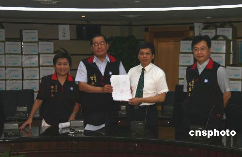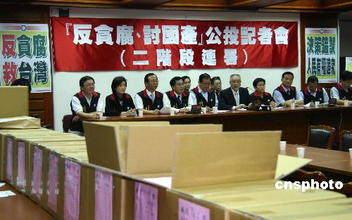 七月二日,台北,中国国民党在“立法院”召开记者会,展示二十四箱连署书。当日,国民党表示已完成“反贪腐讨国产”公投第二阶段连署,目前已有一百零五万余份连署书,预计至四日将超过一百三十万份。国民党秘书长吴敦义表示,公投是为台湾二千三百万民众讨回公道。中新社发 耿军 摄