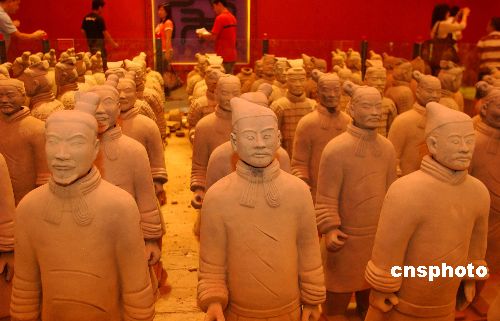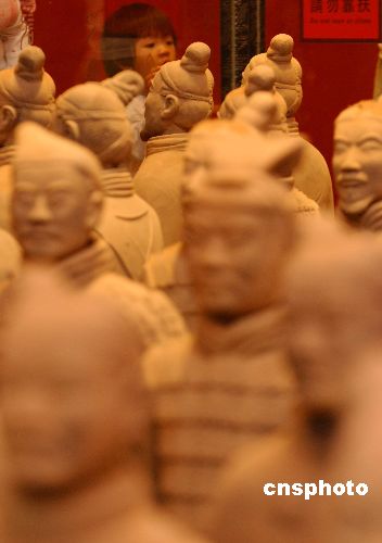 为庆祝香港回归10周年,香港德福广场以历史和文化为主题举行仿真兵马俑展,80件高3呎的兵马俑仿制品吸引市民观看。中新社发 谭达明 摄
