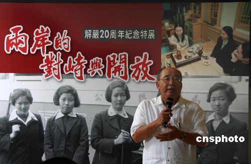 七月三日,台湾文史工作室与中国国民党在台北“二二八纪念馆”合办《两岸的对峙与开放--纪念解严二十周年特展》。国民党主席吴伯雄主持开幕时表示,当年“解除戒严”时他担任台湾“内政部长”,见证了这段两岸对峙的历史,如今国民党要致力于推动两岸和平。该展览的大量历史照片由台湾文史工作室负责人徐宗懋提供。中新社发 耿军 摄