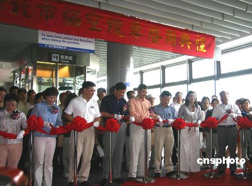 穿梭于木栅山区高空的台北市猫空缆车七月四日下午正式启用。台北市长郝龙斌(左三)邀请前市长马英九(左四)出席启用典礼并一同剪彩。台北市猫空缆车全长四点零三公里,耗资新台币十三亿元,是台湾最长的高空缆车,兼具观光与大众运输功能。单程搭乘时间约二十分钟,共设四座车站及两座让缆绳“转弯”的转角站,每小时载客量两千人。中新社发 耿军 摄